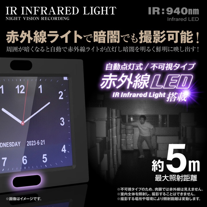 ●赤外線ライトで暗闇でも撮影可能!不可視タイプの赤外線で明るく鮮明に映し出す!