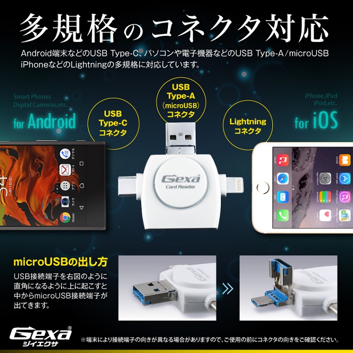 ●本製品は、USBホスト機能(OTG)とマスストレージ機能に対応したスマートフォンおよびタブレット端末、またはUSB2.0コネクタを備えたパソコンに対応しております。対応機種につきましては、ご使用になっているスマートフォン、タブレット端末、またはパソコンのメーカーサイトでご確認いただくかメーカーに直接お問い合わせください。